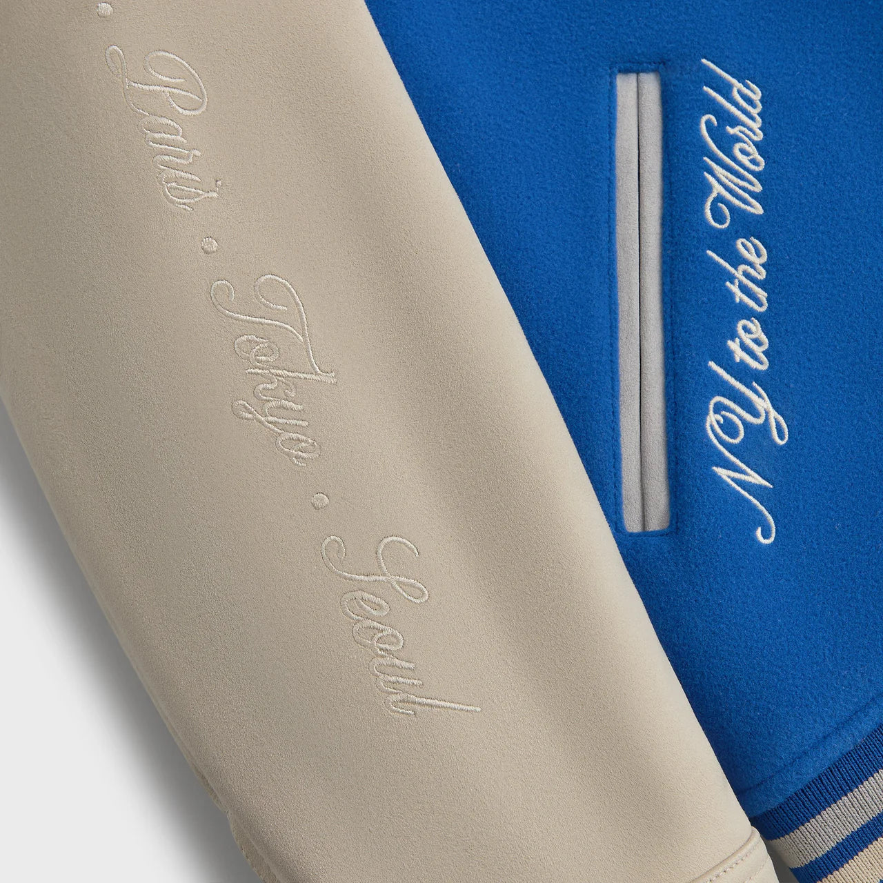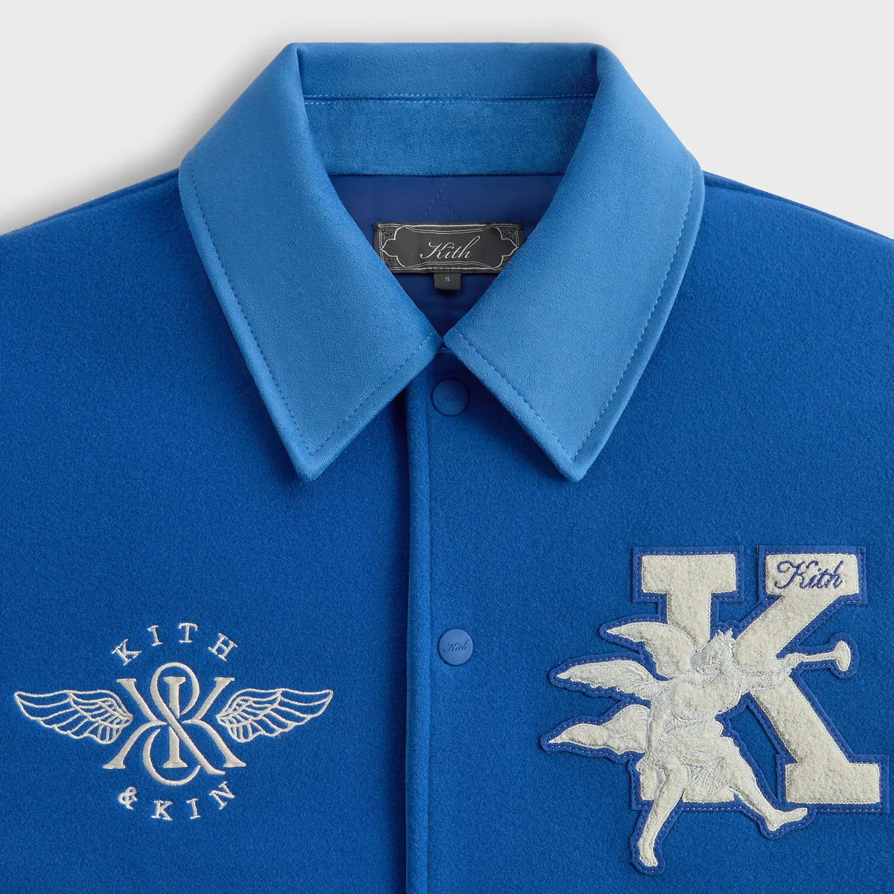 The Wool & Microsuede Varsity Jacket is crafted of heavy double-face wool, featuring microsuede sleeves, a quilted satin lining, and ribbed trim at the sleeve cuffs and hem. It is complete with a snap-front placket, pockets at the sides and interior, a K logo patch at the chest, and beaded artwork on the back.